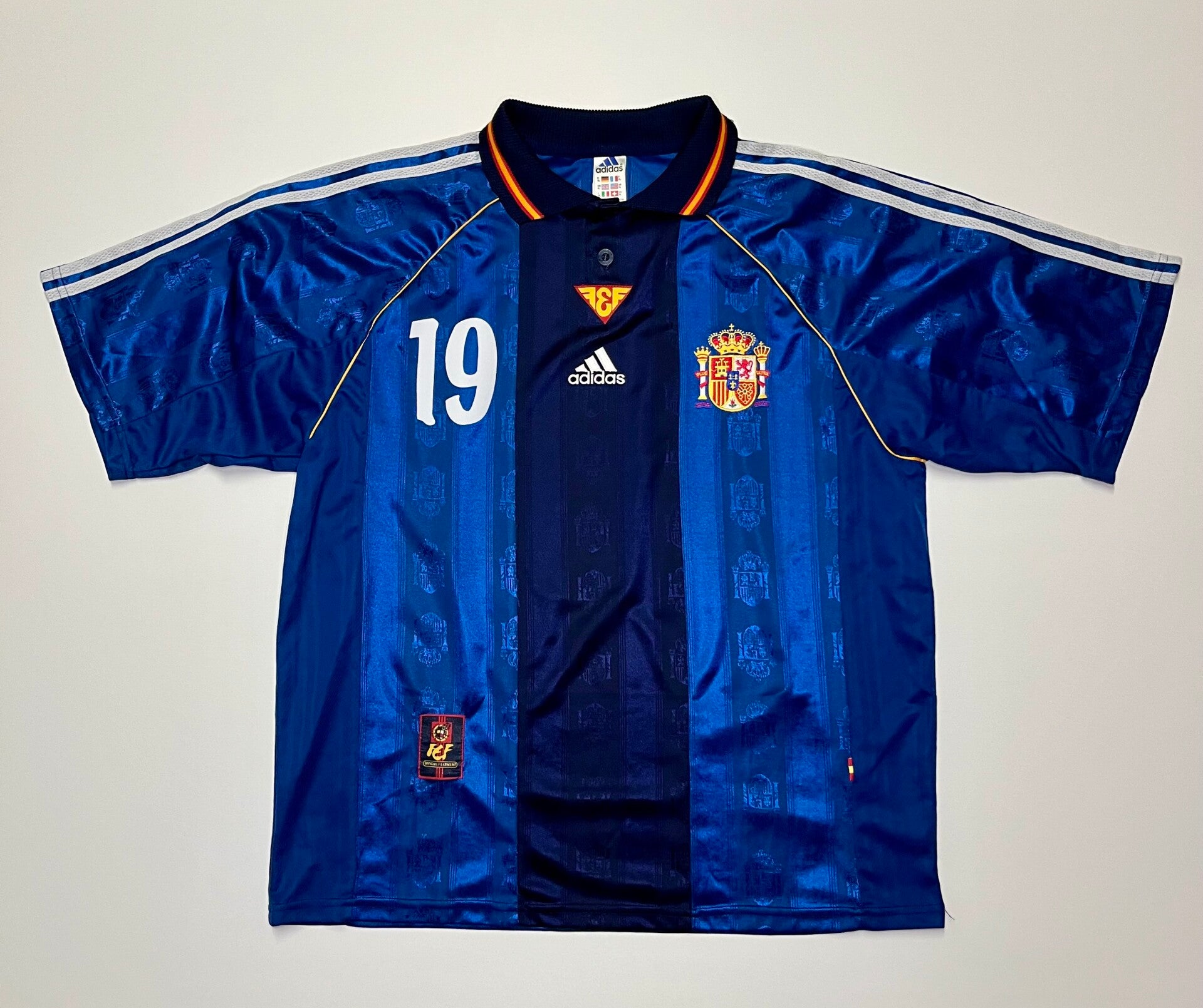 Beschreibung: Originales Away Trikot von Spanien aus den Jahren 1998/99, so wie bei der WM 98 in Frankreich getragen. Mit Nummer 19 von Atletico Madrids Kultstürmer Kiko Narvaéz.